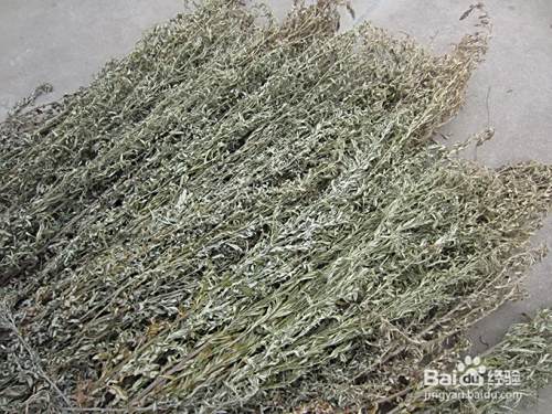 收下的艾草第一种方法要在太阳底下暴晒,晒干的艾草用刀片一节一节的剪下,放在簸箕里面筛选,挑取根基用麻绳捆起来,叶子装在罐头瓶中