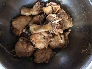鲜鸡腿一根剁3块,焯水洗净,加葱姜丝、花椒、料酒、生抽、老抽、淀粉搅拌均匀加保鲜膜放冰箱腌制一小时