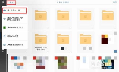 2、在app主界面中点击左上角的导入,可看到有多种导入方式,这里介绍第一种,选择从文件添加文档