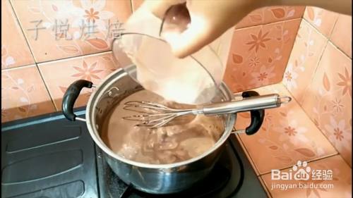 首先把巧克力味的牛奶倒到锅里,然后把糖粉巧克力倒进去搅拌,之后把可可粉倒进去继续搅拌,再把琼脂粉倒入,继续搅拌。