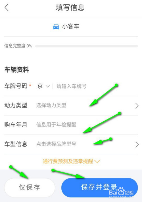 填写信息的界面中,填写你自己车辆的相关信息,填写完毕后点击底部的保存或者保存并登录按钮。