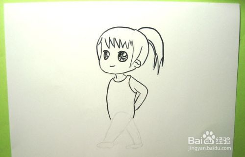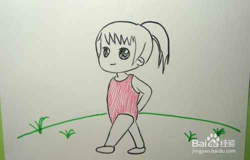 最后,用绿色的彩色笔给人物的背景上,画出一些小草,表示小女孩在草地上练习舞蹈,这样就更加生动了,如下图所示。大家按照步骤也来画画吧。
