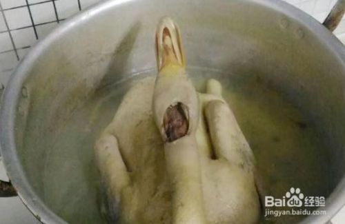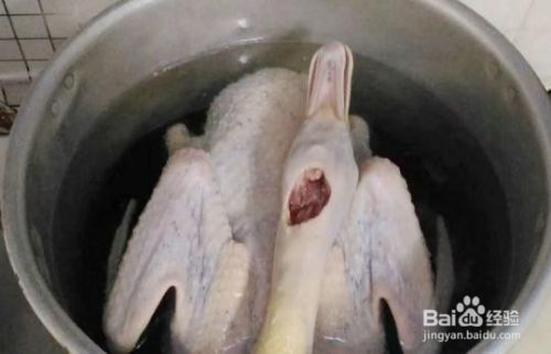 整个鸭子表面抹少量盐,放入锅里加清水大火烧开,中小火慢煮约30分钟,时间的长短要根据鸭的大小而定