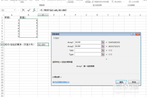 接下来设置函数参数,在ARRAY1处输入A2:A8,在ARRAY2处输入B2:B8;