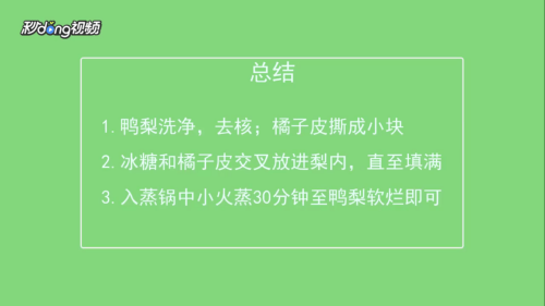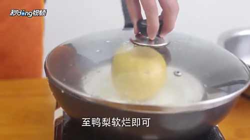 冰糖和橘子皮交叉放入梨内,在蒸锅中蒸30分钟至鸭梨软烂即可。