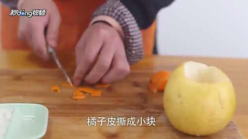 洗净鸭梨,用水果刀抠出梨核,橘子皮撕成小块。