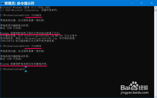 在命令提示符(管理员)窗口中输入 sfc /SCANNOW 命令,按下键盘上的回车键,待其运行完成,显示 资源保护未找到任何完整性冲突 即可。