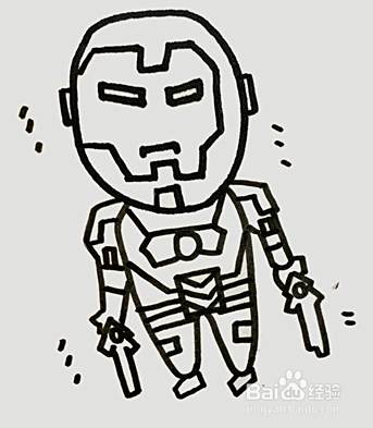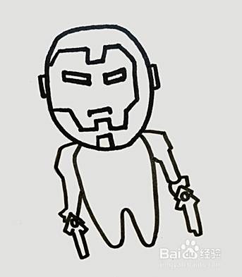 向下画出钢铁侠的身体,双手拿着武器。