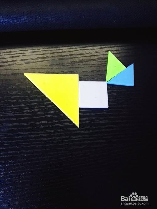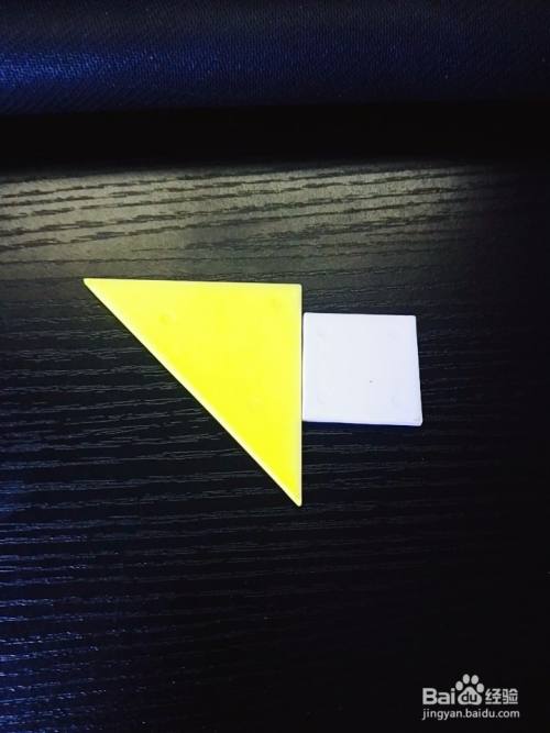 拿出一个白色正方形板放在黄色大号三角形板的右边,如图所示。