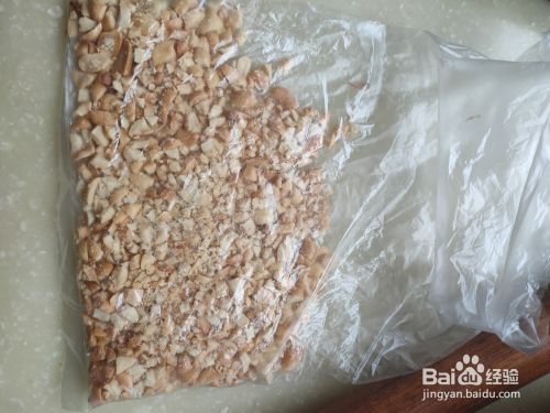 花生要先油炸,然后压碎,不要太小,否则吃起来就不像花生了