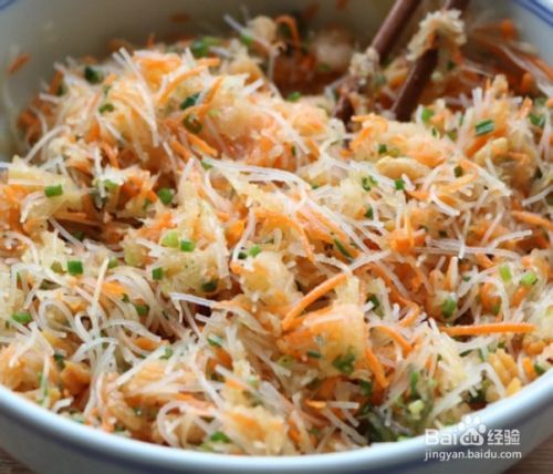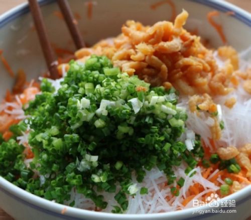 然后把粉丝、葱花、虾仁全部放到萝卜丝碗中。