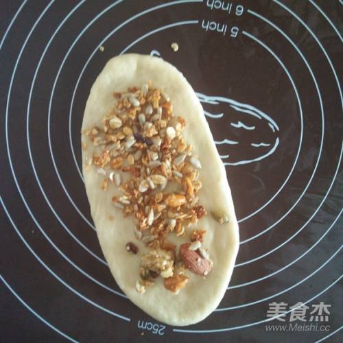5醒发好的面团擀成长舌条,撒上一些烤坚果,烤坚果可以参考我前面那个谷物菜谱哦!从上往下卷