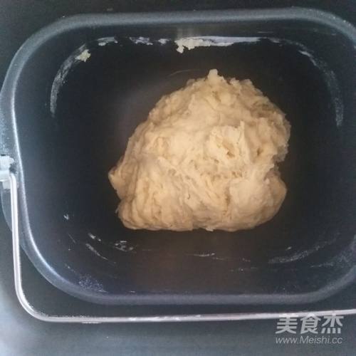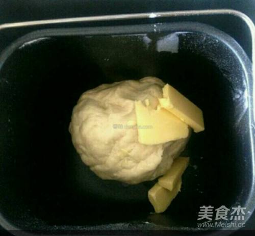 1面包除黄油以外,依次倒入牛奶,鸡蛋,面粉,盐,糖,放对角,酵母中间和面25分钟