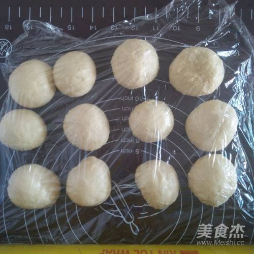 4面团发酵两倍大时,揉开排气分成12等份,用保鲜膜包住醒发15分钟