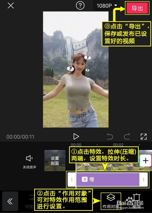 设置特效。点击已添加的特效,拉伸(压缩)特效轨道两端,设置特效时长;点击“作用对象”,可对特效作用范围进行设置;点击“导出”,保存或发布已设置好的视频。