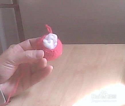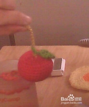 把两头一抽,就象小苹果了,上面钩一个黄色的小辫子,再钩一个小叶子,这个叶子:来回钩短针,就是加加减减针的事,不细说了。比上回那个草莓的好看。。。