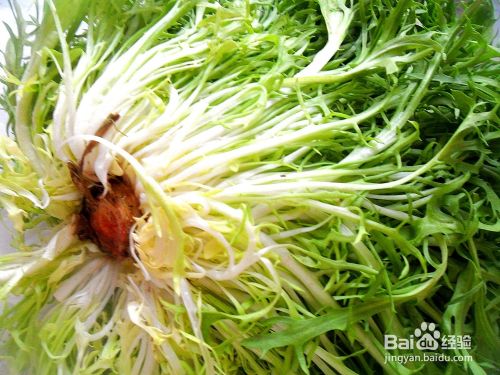 取一棵苦菊,先摘去老叶黄叶,切掉根部,然后分散开用清水冲洗。