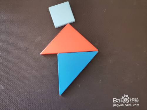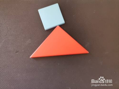 拿出一个深蓝色大三角形放在红色大三角形的下面,如下图所示。