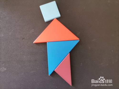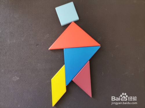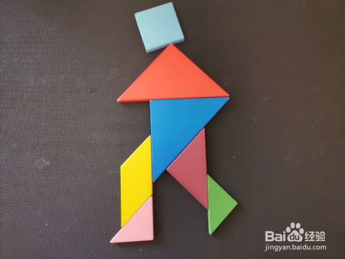 最后我们把粉色小三角形放在黄色平行四边形的下面,一个散步的人就拼好了。