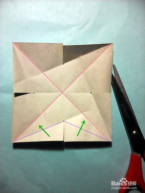 现在,我们用剪刀沿绿色实线至标注的交汇点剪开。