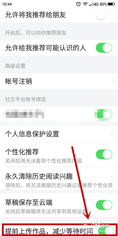 在打开的【账号和隐私设置】页面,上滑屏幕,在页面底部找到并选择【提前上传作品,减少等待时间】点击。