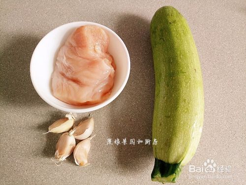 备齐食材:鸡肉、西葫芦、蒜瓣。