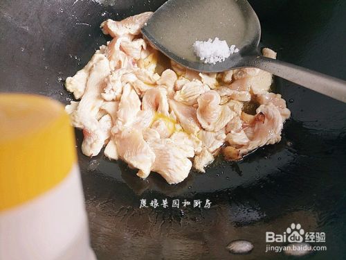翻炒至鸡丝变色,加入食盐和酱油。
