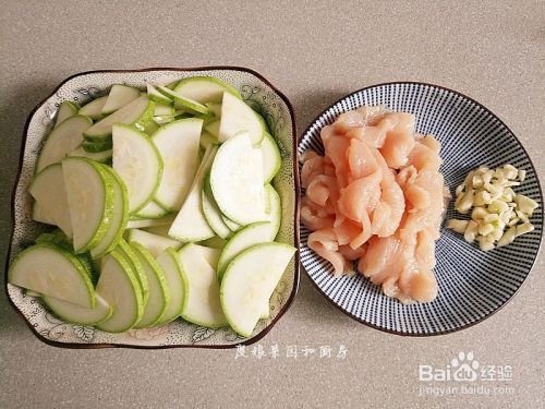 鸡肉洗净切丝,西葫芦洗净切片,蒜瓣去皮切碎。
