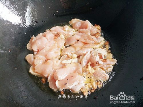 锅中倒入油烧七成热,加入蒜爆香,然后加入鸡肉翻炒。