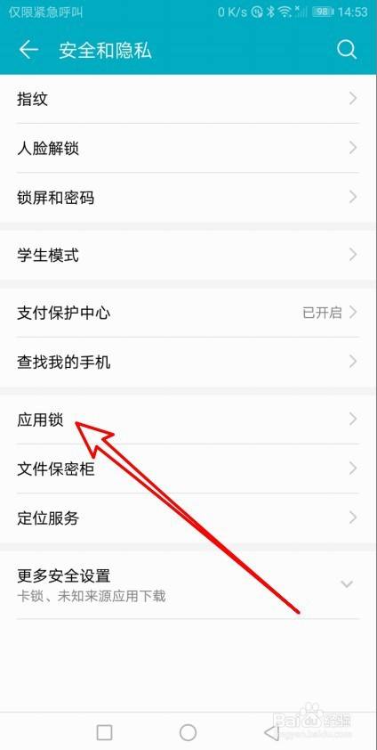 在打开的安全和隐私页面,点击应用锁的设置项。