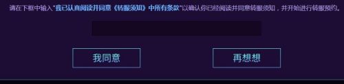在编辑框里面输入要求的文字我接受转服协议,然后点击提交,等待转服申请结果,通过之后才能进行大区转入和转出。