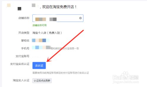 然后我们首先填写一下自己的店铺名称,然后点击一下,下面的去认证按钮。