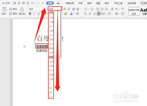 点击字号栏后,打开字号大小对照表,可以对选中文字段落字号大小进行调节。