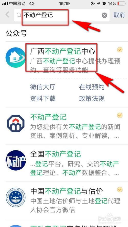 在弹出的搜索框里输入“不动产登记”名称。然后在下方选择自己所在地的不动产公众号。