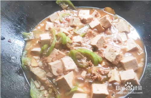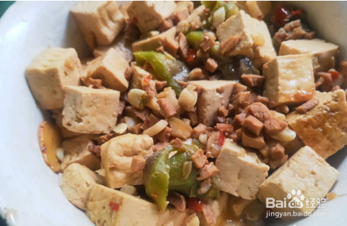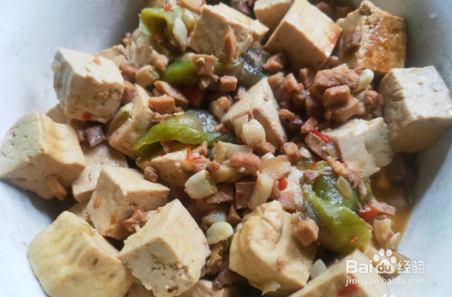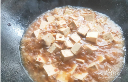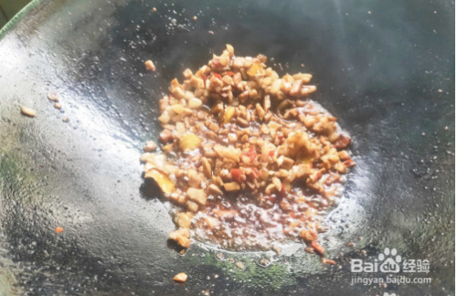 放入豆瓣酱炒断生,加入水煮猪肉切成的碎丁,翻炒均匀后,放入少许酱油爆出酱香味。