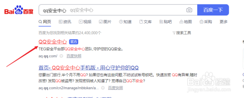 1、打开百度浏览器搜索“qq安全中心”。