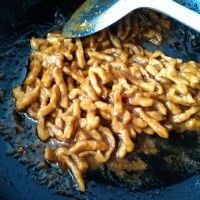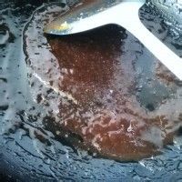 6. 留底油,放入55g甜面酱、15g白糖,小火炒制片刻,再倒入葱姜水,用锅铲不停的搅拌,炒至酱汁浓稠