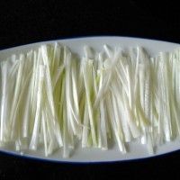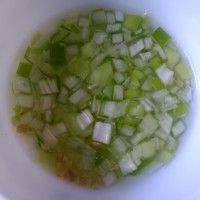 1. 取一小节葱绿部分切小粒,生姜也切小粒,用清水侵泡半小时以上后,用手捞出葱姜粒,并用力将汁挤出