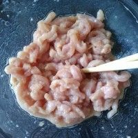 3. 切好的肉丝中放入少许盐、鲜酱油2g、料酒、白胡椒粉和玉米淀粉8g,倒入少许清水将其调拌均匀,放置10分钟左右