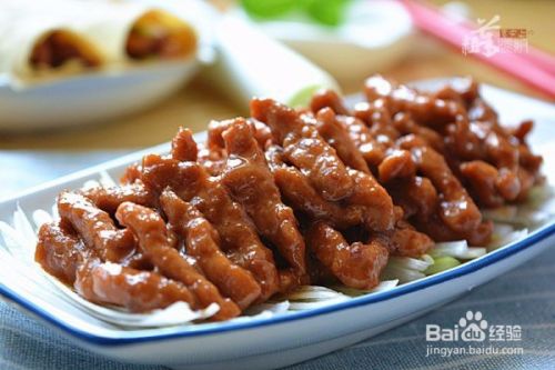 8. 将京酱肉丝盛放在葱丝上,食用时可卷入豆腐皮中,味道非常棒!