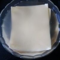 2. 豆腐皮切小块,放入沸水中焯制片刻,捞出后用煮过的水将豆腐皮浸泡,以免豆腐皮表面变干,等食用之前将水倒出