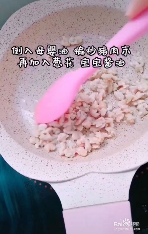 锅中加入少许核桃油,将肉末炒熟,加入葱花和宝宝酱油;