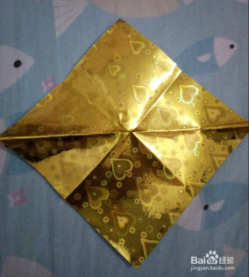 展开后根据折痕,将有横折痕的两个角向中心点折起来,如图: