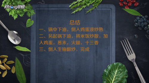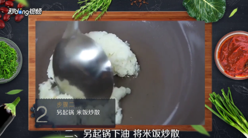 另其锅下油,将米饭炒散,加入鸡蛋、葱末、火腿、十三香。
