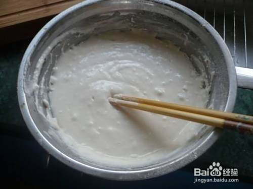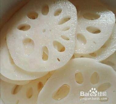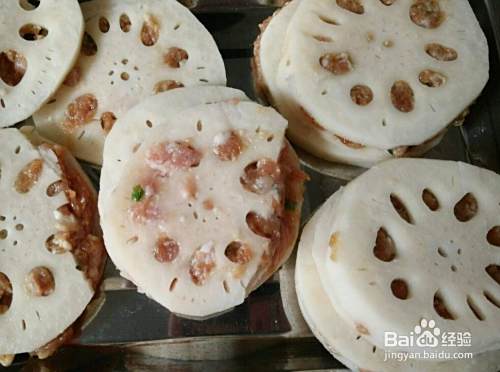取两片藕片,中间夹放拌好的肉馅,外面挂上面糊。