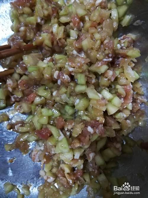 瓠子洗净,切成两半,去囊,切成小块,和肉馅、葱姜、食用油、酱油、味极鲜、五香粉、盐,搅拌均匀,制成肉馅。