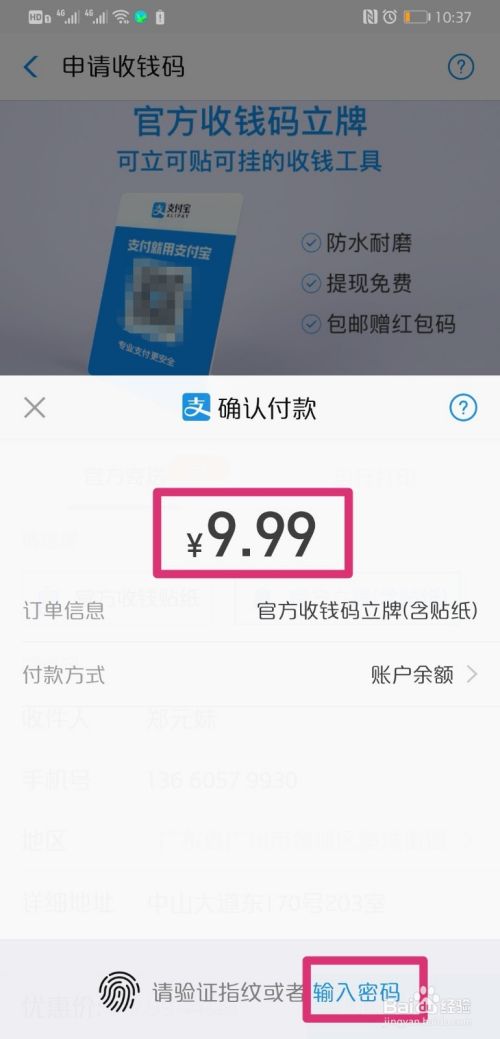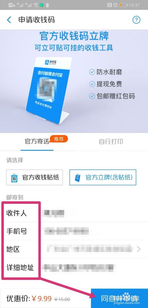 选择好寄送方式和收钱码类型之后,输入收件人、手机号码、邮寄地址,最后点击同意并申请。
