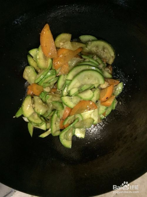 然后将西葫芦片和胡萝卜片全部倒进去,混合翻炒均匀