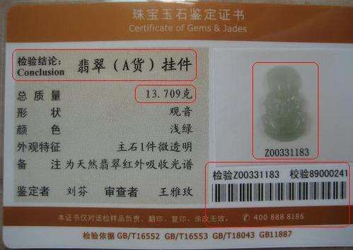 证书上一般都有翡翠的重量,其数值与实物必须对应。如果不能对应,且偏差较大,则该证书就可能是伪造的。同时,证书上也会有翡翠的照片,可以与实物进行对照比较,这样可以确认该证书是否假冒,或者一证多用。