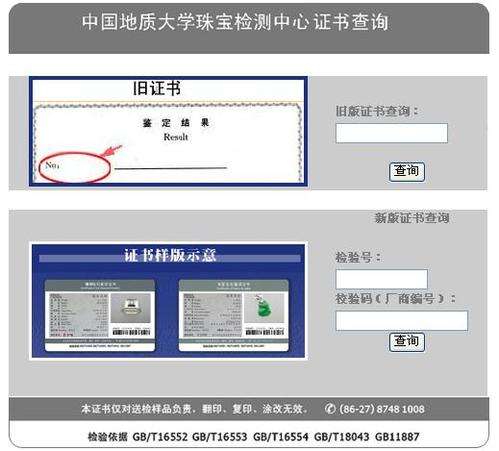 正规的鉴定证书上一定会留有真实有效的联系方式,比如电话或其官方网址。我们可以通过电话或者互联网进行查询、核对。不具备这种支持的鉴定机构,其鉴定结论是不可信的。如下图为中国地质大学珠宝检测中心的网上查询页面: